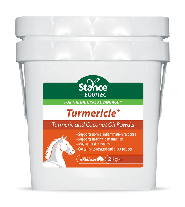 What is Turmericle? Turmericle is a unique powdered blend of well researched nutraceutical herbs including two varieties of turmeric, black pepper and resveratrol, which may assist with conditions such as joint inflammation and skin conditions. Combined with powdered coconut oil, this easy to feed powder is suitable for horses, and dogs. About the Ingredients Turmeric Turmericle contains a blend of two different species of turmeric to optimise the benefits they both offer. One form, Curcuma longa, is the traditional type of turmeric commonly used in cooking, foodstuffs, cosmetics and medicine. Curcuma xanthorrhiza, has been used as a traditional medicinal plant in some tropical countries such as Indonesia and Malaysia. It contains the xanthorrhizal oil which confers unusual benefits. PowerStance® powdered coconut oil PowerStance is powdered coconut oil designed to make feeding oil easy. Coconut oil contains high levels of medium chain triglycerides (MCTs) which provide the body with a readily available source of lauric acid, which converts to monolaurin and may provide anti-bacterial, anti-microbial and anti-fungal properties. The benefits of supplementing animals with coconut oil may include improved digestive health, enhanced coat and skin condition. Coconut oil is absorbed direclly into the portal blood, and therefore is metabolised faster than other oils. Ground Black Pepper Curcumin is treated as a foreign substance by the liver. It is therefore rapidly metabolised and excreted. Piperine in black pepper blocks curcumin excretion by the liver and increases curcumin bioavailability. Piperine activity is reduced in sunlight. Turmericle must be stored in a sealed container to maintain the efficacy of the back pepper. Resveratrol Resveratrol is produced in plants to maintain their general health. Normal body functioning gives rise to free radicals with production greatly increased during inflammation and stress. Resveratrol has been added to