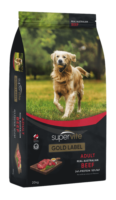 ADULT DOG BEEF WITH REAL AUSTRALIAN BEEF Super Vite Gold Label with Real Australian Beef, is a complete and balanced dry dog food. This well crafted, gourmet recipe is infused with premium quality ingredients to give your dog the right nutrition and delicious taste. Product Benefits Active Energy A super blend of protein, fat and vitamins to sustain an active life Real Beef Made with real Beef providing the essential building blocks for strong muscles. Shiny Coat Contains Omega 3 & 6 fatty acids essential for healthy skin & coats. Healthy Digestion Provides natural fibres from beet pulp for a healthy digestive system Natural Contains natural antioxidants and no artificial colours or flavours Immune Health With essential vitamins, minerals & natural antioxidants for immune health. INGREDIENTS & NUTRITION Meat & meat by-products (beef, chicken, &/or lamb) and/or poultry byproducts, wholegrain wheat, wholegrain barley &/or corn &/or sorghum, Cereal by-products and/or vegetable proteins, Fats & Oils (from beef, lamb, fish, poultry &/or vegetable), Chicken gravy, Beet pulp, Salt, Minerals (calcium, phosphorus, potassium, copper, iodine, manganese, magnesium, selenium, zinc), Vitamins (A, C, D3, E, B1, B2, B3, B5, B6, B9, B12 & choline), Natural antioxidants with Rosemary extract, Garlic.