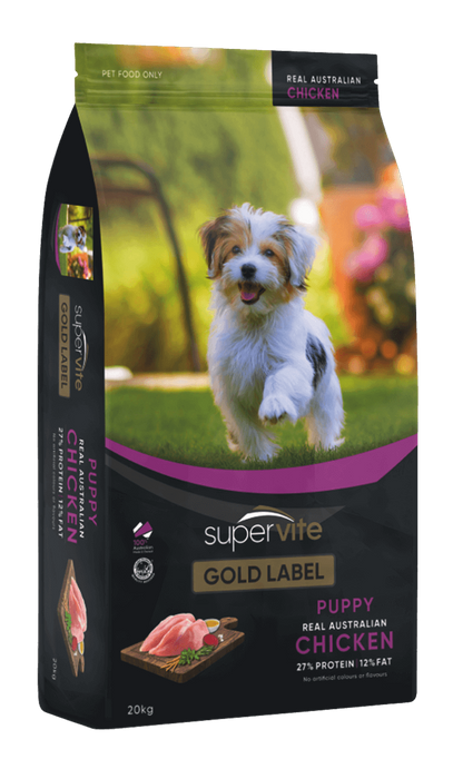 PUPPY CHICKEN WITH REAL AUSTRALIAN CHICKEN Super Vite Gold Label Puppy with Real Australian Chicken, is a complete and balanced dry dog food. This well crafted, gourmet recipe is infused with premium quality ingredients to give your puppy the right nutrition and delicious taste. Product Benefits Active Energy A super blend of protein, fat and vitamins to sustain an active life Real Chicken Made with real Chicken providing the essential building blocks for strong muscles. Shiny Coat Contains Omega 3 & 6 fatty acids essential for healthy skin & coats. Healthy Digestion Provides natural fibres from beet pulp for a healthy digestive system Natural Contains natural antioxidants and no artificial colours or flavours Immune Health With essential vitamins, minerals & natural antioxidants for immune health. INGREDIENTS & NUTRITION Meat and meat by-products (chicken, beef, and/or lamb) and/or Poultry by-products, Wholegrain wheat and/or cereal by-products, Wholegrain sorghum and/or barley, Fats &/or oils (beef, ovine, chicken, fish &/or vegetable), Chicken gravy, Fish and fish by-products (tuna and/or salmon) and/or vegetable proteins, Beet Pulp, Salt, Essential Minerals (including calcium, phosphorus, magnesium, iron, copper, manganese, zinc, iodine, selenium), Choline chloride, Essential vitamins (including A, C, D3, E, B1, B2, B3, B5, B6, B9, B12), Natural Antioxidants with rosemary extract, Garlic.