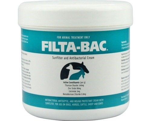 Filta-Bac Antibacterial Sunscreen is a dual action product for your pet's skin care. It provides effective protection from the sun for sensitive or damaged skin, while also acting as an antibacterial treatment to assist healing for wounds or skin conditions. Suitable for: Dogs, Horses, Cattle, Sheep and Goats