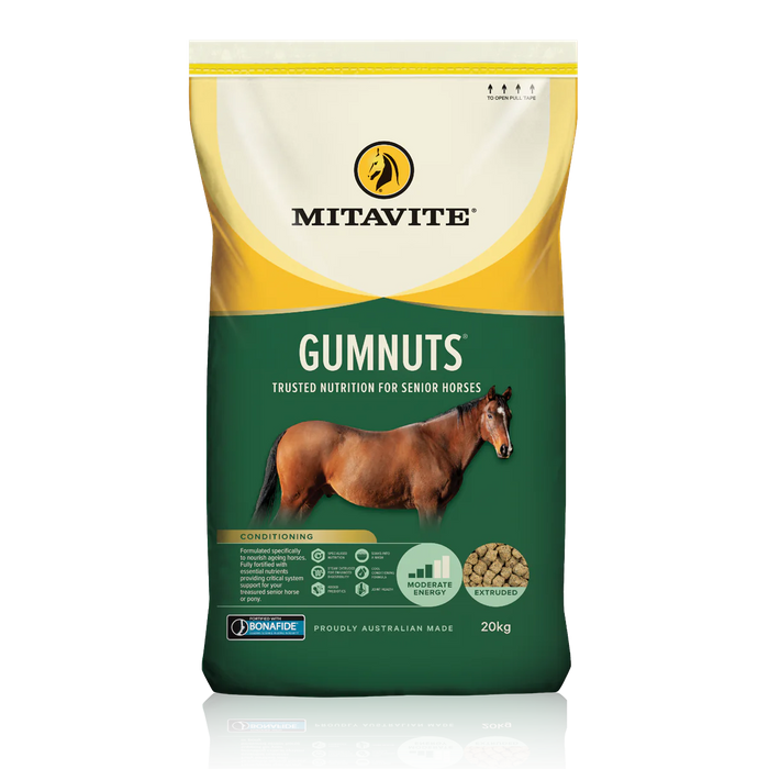 Mitavite® Gumnuts® is Australia’s original and most trusted feed especially formulated for aged horses and ponies. Highly nutritious, palatable and safe to feed, Gumnuts® provides a unique balance of vitamins and minerals specifically formulated to address the challenges of old age. Omega 3 oils, antioxidants and essential amino acids are provided in a highly digestible form. Gumnuts® reduces to a soft mash when water is added.