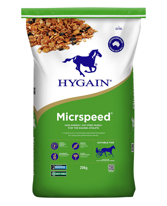Micrspeed® Hygain 20kg HIGH ENERGY, OAT-FREE MUESLI FOR THE EQUINE ATHLETE A nutrient-rich, micronized sweet feed formulated for racing and performance horses. Formulation Highlights: ENERGY FOR PERFORMANCE: Micrspeed® contains a scientifically balanced blend of digestible starch, high-fats and chromium to fuel the demands of racehorses and hard-working equine athletes. MICRONIZED FOR DIGESTIBILITY: Infrared micronization gelatinises starch granules inside the grains, enhancing enzymatic breakdown in the small intestine. This improves energy utilisation and reduces the risk of undigested starch reaching the hindgut, promoting digestive health and reducing digestive disturbances. BONE SUPPORT WITH BONAFIDE®: Racing and stabled horses often have restricted pasture access, reducing natural Vitamin K1 intake. Micrspeed® includes Quinaquanone® (Vitamin K1 and K2) in Bonafide® to promote bone density and formation. YUCCA SCHIDIGERA: Yucca schidigera supports overall equine health and helps reduce stable emissions from manure by binding ammonia in the digestive tract, promoting a healthier environment and enhanced respiratory comfort.