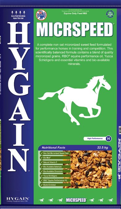 HYGAIN® MICRSPEED® is a non oat micronized sweet feed formulated for performance horses in training and competition. This scientifically balanced formula contains a blend of quality micronized grains, HYGAIN® RBO® Equine Performance Oil®, Yucca Schidigera and essential vitamins and bio-available minerals.