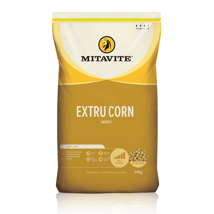 Mitavite® Extru® Grains: Provide effective, safe feed-room options. Corn has long been used as an energy source in horse feeds. In its raw form it is poorly digested and when cracked, it oxidises quickly resulting in reduced nutritional value. Mitavite® steam-extruded Extru® Corn is palatable, highly digestible and locks in the nutritional value for longer. Also available in Mitavite® bulka bags.