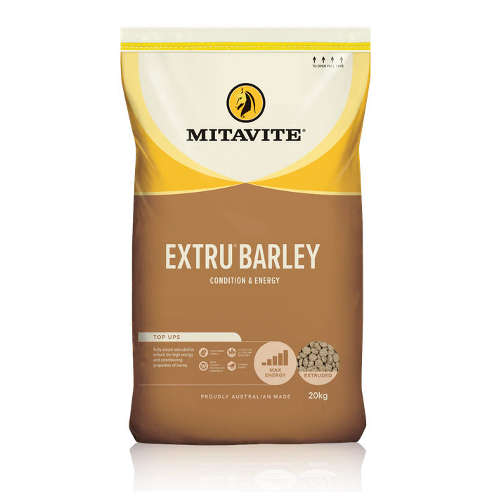 Mitavite Extru® Grains provide effective, safe feed-room options. Mitavite Extru® Barley is an excellent source of energy and fibre, making it a popular ingredient in horse rations. When fed raw barley is poorly digested in a horse's small intestine. Rolling or steam-flaking improves digestibility a little, roasting significantly. Steam extrusion has the greatest effect, increasing digestibility to over 90% in the small intestine. Also available in Mitavite® bulka bags.