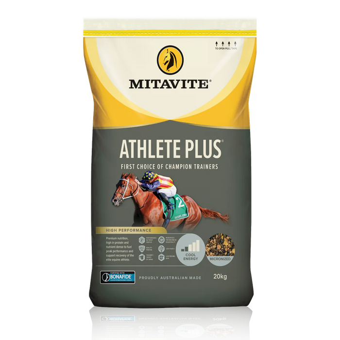 Mitavite® Athlete Plus® is rich in scientifically balanced nutrients, trace minerals and electrolytes. Athlete®'s high levels of Essential Amino Acids assists with the rapid replenishment of fuel stores and muscle repair after fast work or racing, reducing recovery time. When mixed with grains of your choice, the palatable muesli style formulation of Athlete Plus® provides a complete ration for your high performance equine athlete.