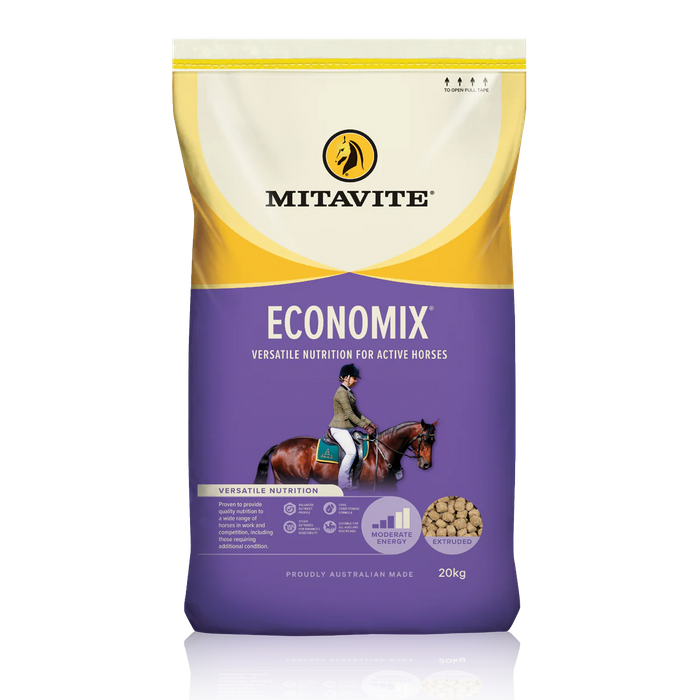 Mitavite® Economix Active® has been tried and trusted over many years. It provides safe, cost effective nutrition for competition and show horses, working stock horses, pleasure horses and ponies and spellers in need of conditioning. Steam extruded to unlock the full nutritional value of its ingredients, Economix Active® is fortified with oils rich in Omega 3 to provide cool sustained energy.