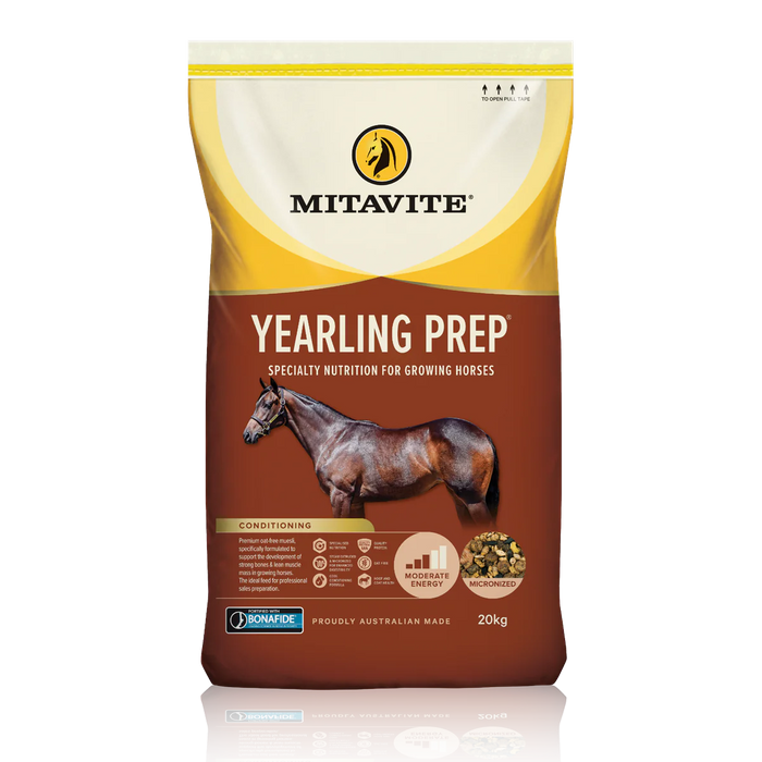 Complete balanced ration for professional yearling preparations. Scientifically formulated, highly palatable oat free cool feed. Mitavite® Yearling Prep® contains chelated minerals and Essential Amino Acids in a horse specific profile for balanced bone and muscle development. Research has shown that results in the sale ring are maximised when horses are well developed and well furnished. Yearling Prep® helps you achieve the best possible results.
