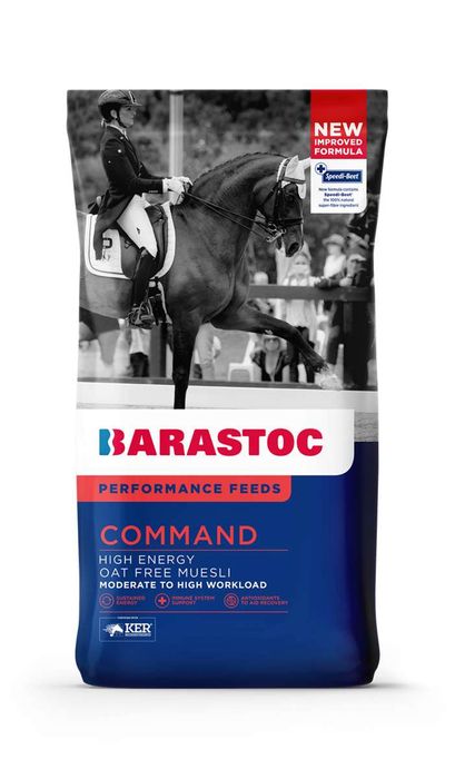 High energy, high performance oat-free muesli. High energy, high performance oat-free muesli, Barastoc Command is free of any unprocessed grain. Its lower starch formulation provides the energy that performance horses need – without causing anxiety or problematic behaviour.