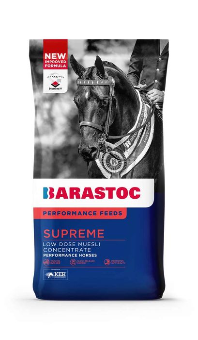 Supreme Formulated with premium quality ingredients tailored for superior topline development, Barastoc Supreme is formulated with essential amino acids which contain the building blocks of protein. Description Nutritional info Feed Rates Designed specifically with topline development in mind, brand new Barastoc Supreme is a low starch, high fat, high protein feed that also contains Diamond V® XPC to improve utilisation of fibre and reduce lactic acid accumulation during exercise. What will it do for my horse? High in essential amino acids and branch chain amino acids, the building blocks of protein, for superior topline, muscle development and repair. Contains Diamond V XPC® to enhance gut health, improve utilisation of fibre and minerals, and to create an environment that enhances the horse' gut microbiome. A low starch, high protein and high fat, slow energy release feed for horses with a natural metabolism that does not required additional calories. Enriched with a performance dose of Vitamin E and selenium for superior antioxidant function, in addition to immune and muscle system support. Includes Barastoc Gastrolize™ to aid in buffering the stomach and hindgut and may provide relief from the discomfort caused by gastric ulcers