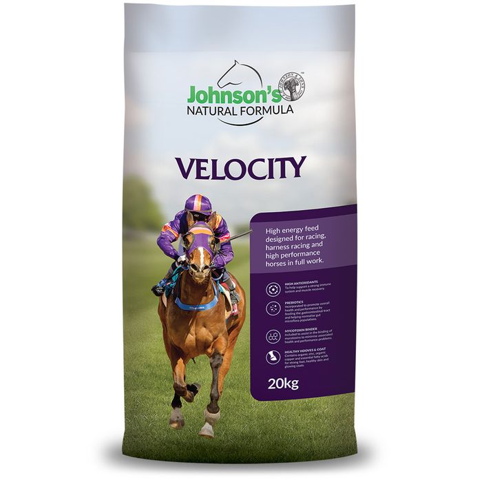 Johnson’s Velocity is a high energy, well balanced pelleted feed designed to deliver useable, sustained, safe energy to race and harness horses in medium or hard work, competition horses, or horses requiring more energy. High in antioxidants to aid in recovery from hard work, includes a prebiotic and probiotic to maintain optimal gut health, and contains a mycotoxin binder to help guard against mycotoxins which can compromise health and performance.