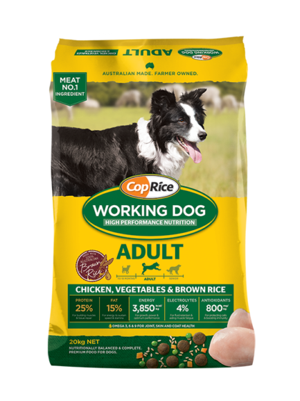 Working dogs are elite endurance athletes, high performance labourers and your best mates. They keep you company during long, strenuous days and push themselves in through the toughest conditions, so they deserve nothing but superior quality nutrition. CopRice Working Dog Adult Chicken is specially developed nourishment for hard working adult dogs in need of diets high in fat with balanced and highly digestible carbohydrate sources, to fuel the sustainable energy required for gruelling workloads.