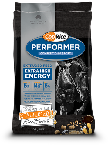 A nutrient dense feed formulated to provide sustained energy for horses in moderate to heavy exercise including endurance, eventing, show jumping, dressage and racing. It contains a high level of rice bran oil which increases the energy density of the diet and helps delay muscle fatigue. It is also rich in antioxidants including gamma oryzanol and tocopherols, which assist with post-exercise muscle recovery and repair.