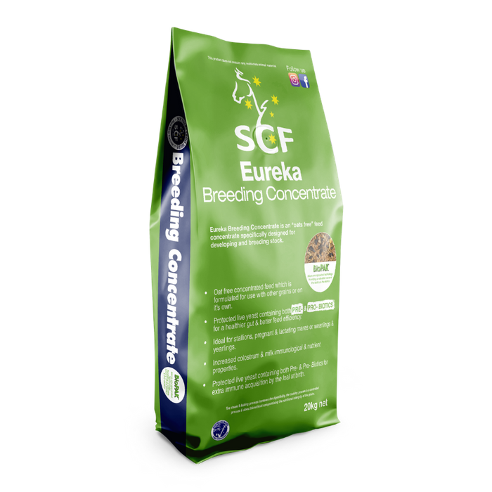 Eureka Breeding Concentrate Eureka Breeding Concentrate is an 'Oats Free' concentrated feed specifically designed for all types of breeding stock. Eureka Breeding Concentrate is for developing, conditioning breeding and resting horses. Eureka Breeding Concentrate contains vitamins & minerals to meet the nutritional demands of breeding and young growing stock. Pre & Probiotics already added! With added BioPAK ULTIMATE micro encapsulated technology for a healthy gut and better grain utilization, which in-turn will improve microflora. This will also help reduce lactic acid, gastric ulcers and reduced weight loss.