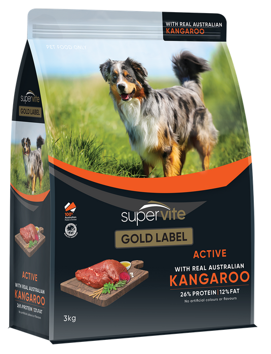 ACTIVE KANGAROO (ADULT DOG) WITH REAL AUSTRALIAN KANGAROO Super Vite Gold Label with Real Australian Kangaroo, is a complete and balanced dry dog food. This well crafted, gourmet recipe is infused with premium quality ingredients to give your dog the right nutrition and delicious taste. Active Energy A super blend of protein, fat and vitamins to sustain an active life Real Kangaroo Made with real Kangaroo providing the essential building blocks for strong muscles. icon coat Shiny Coat Contains Omega 3 & 6 fatty acids essential for healthy skin & coats. Healthy Digestion Provides natural fibres from beet pulp for a healthy digestive system Natural Contains natural antioxidants and no artificial colours or flavours Immune Health With essential vitamins, minerals & natural antioxidants for immune health. INGREDIENTS & NUTRITION Meat & meat by-products (chicken, beef, kangaroo, and/or lamb) and/or Poultry by-products, Wholegrain wheat, Cereal by-products and/or vegetable proteins, Wholegrain sorghum and/or barley, Fats &/or oils (beef, ovine, chicken, &/or vegetable), Chicken gravy, Beet Pulp, Salt, Essential Minerals (including calcium, phosphorus, magnesium, iron, copper, manganese, zinc, iodine, selenium), Choline chloride, Essential vitamins (including A, C, D3, E, B1, B2, B3, B5, B6, B9, B12), Natural Antioxidants with rosemary extract, Garlic.