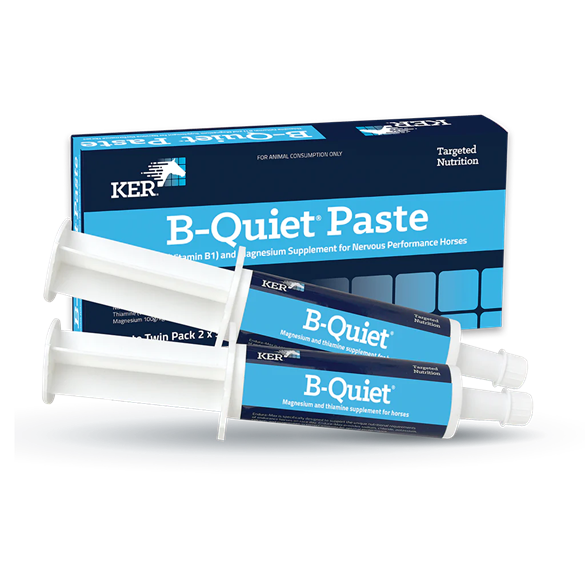 B-QUIET PASTE provides concentrated levels of thiamine, an important B-vitamin, and magnesium. Why use B-Quiet Paste? Combination of thiamine and magnesium to support excitable, high strung or anxious horses Recent research has found that supplementing thiamine and organic magnesium to your horse’s diet can reduce anxiety by assisting the maintenance of nerve function Thiamine plays a role in carbohydrate metabolism and nerve transmission Horses on high-grain, low forage diets or hard-working horses may have reduced production of thiamine by intestinal bacteria because of stress or hindgut acidosis Magnesium has an important role in muscle and nerve function Horses that are deficient in magnesium can show signs of spooky and excitable behaviour and may suffer muscle tremors or cramping Recent research has shown that magnesium supplementation may positively influence behaviour in horses during stressful situations Does not contain prohibited substances B-Quiet is formulated to manage the symptoms of thiamine and magnesium deficiency, including hyper-irritability, nervousness and anxiety, which may result in decreased performance.