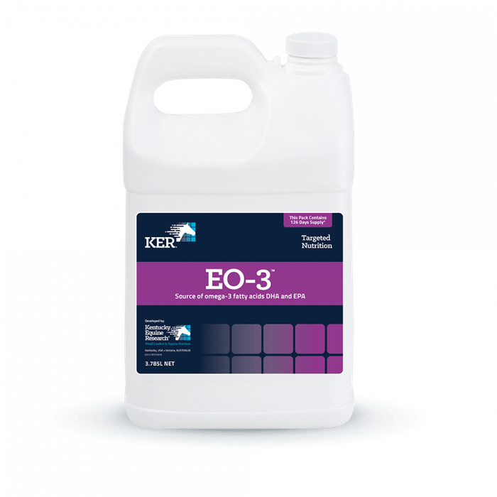 Horses are often fed diets composed entirely of grain mixes and hay. Such diets are rich in omega-6 fatty acids but extremely low in omega-3 fatty acids. If vegetable oil is added to the ration, it further skews the ratio, with omega-6 fatty acids being overrepresented. To help counteract this imbalance, horses should be supplemented with omega-3 fatty acids, the richest sources of which are fish oils. Kentucky Equine Research developed EO-3™, a potent marine-derived oil that is rich in omega-3 fatty acids. EO-3 is a palatable oil that is top-dressed onto the feed. EO-3 contains the omega-3 fatty acids DHA and EPA. KER has shown EO-3 to be highly palatable when compared to other marine-derived oils. EO-3 is intended to be fed to horses of all classes and working levels to improve the critical omega-3:omega-6 ratio in their diets. RESEARCH PROVEN Daily intake of EPA and DHA from KER EO-3™ significantly increases red blood cell membrane EPA and DHA, but a similar amount of omega-3 in the form of ALA from flax (linseed) oil does not.