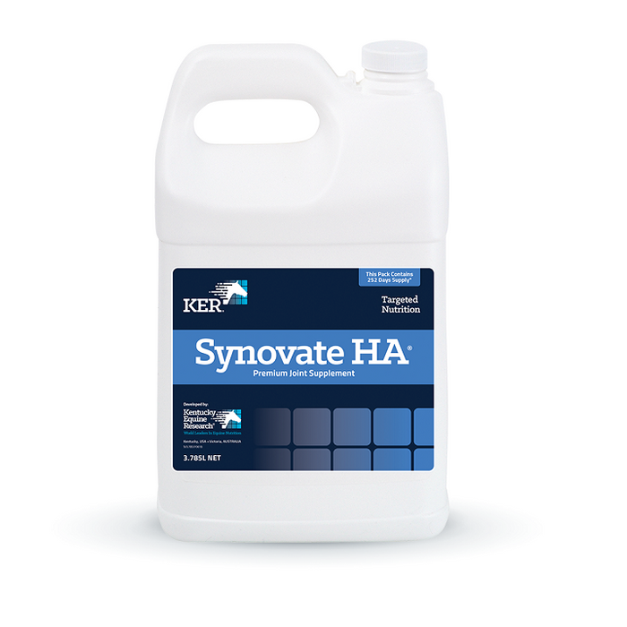 Synovate HA® delivers high molecular weight sodium hyaluronate for horses in an easy-to-administer liquid. Maintaining proper joint health is an important factor in the longevity of a horse’s career. The nutrient-rich synovial fluid is a vital component that fills the joint capsule to aid in smooth passage of one bone over another and to absorb shock from high-impact work. Sodium hyaluronate is a glycosaminoglycan that is an important structural component of joint cartilage and is responsible for the viscosity (thickness) of the synovial fluid. Synovate HA helps manage horse joint health proactively by preventing the loss of hyaluronic acid.