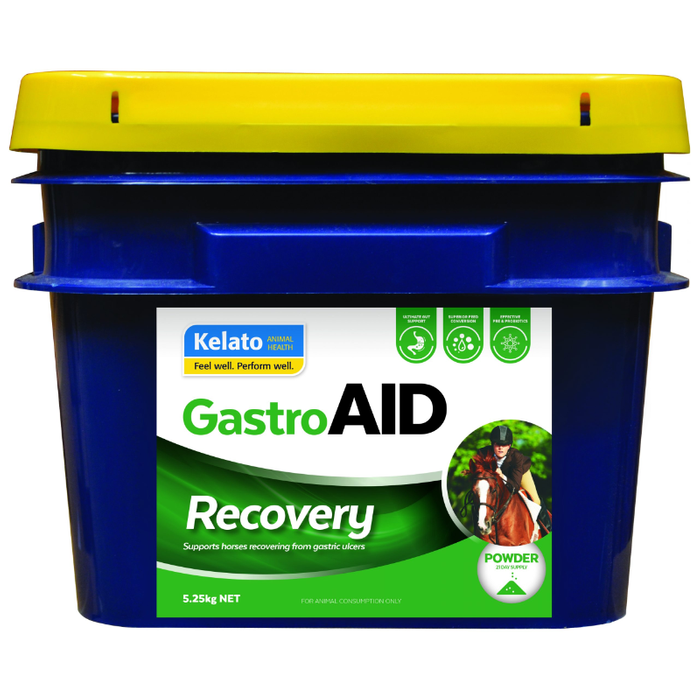 Supports horses recovering from gastric ulcers. What is GastroAID Recovery? GastroAID Recovery is Kelato’s ultimate supplement, targeting both foregut and hindgut health, supporting recovery from gastric ulcers and other common digestive conditions. GastroAID Recovery is unique as it provides the “coating agents” pectin and lecithin, which form a barrier over the stomach wall to protect it from acid burn and strengthen the mucosal lining. GastroAID Recovery is designed for horses with equine gastric ulcer syndrome (EGUS), horses recovering from EGUS, or those under a significant amount of stress. If your horse is prone to developing gastric ulcers, we recommend using GastroAID Recovery during stressful periods. How does GastroAID work? Moderates Gut Transit Time: Wholegrain oat flour delays stomach emptying to maintain a healthy rate of food passage through the digestive system, allowing for optimal digestion and absorption of nutrients. Buffers Gastric Acid: Antacids stabilise (buffer) stomach pH to help reduce irritation to the stomach lining. Coats Stomach Lining: Pectin forms a gel-like layer over the stomach to help to protect the lining from the corrosive effects of gastric acid. Strengthens Stomach Lining: Lecithin is a phospholipid that improves the integrity of the epithelial cells to help maintain a healthy stomach lining. Promotes Beneficial Microbes: Levucell SC® live yeast probiotic reduces lactic acid in the hindgut (stabilises pH) and stimulates the growth and activity of beneficial bacteria for optimal feed conversion efficiency. Features and Benefits Ultimate gut support Superior feed conversion Effective pre- & probiotics A healthy digestive system means a healthier horse. GastroAID Recovery will help bring your horse back to its full potential by: Optimising total gut function Protecting total gut health Improving feed conversion efficiency GastroAID Recovery helps your horse’s gut better cope with th