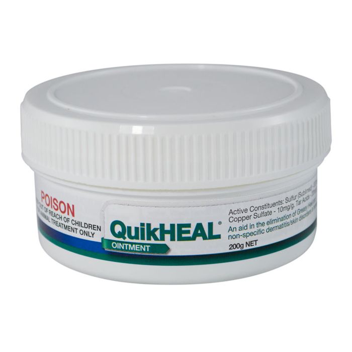 Antifungal, antibacterial and water-resistant ointment to eliminate greasy heel and other general skin disorders. What is QuikHEAL? QuikHEAL is a broad-spectrum antibacterial and antifungal ointment, containing sulphur and copper sulphate to assist rapid healing from greasy heel and other skin conditions. QuikHEAL treats a broad range of conditions: Greasy heel Rain Scald Ringworm Dermatitis Girth gall Saddle sores Nicks and cuts How does QuikHEAL work? As soon as bacteria or fungi enter broken skin they inflame the skin, causing mild to severe irritation. The active ingredients in QuikHEAL effectively kill the bacteria and fungi. QuikHEAL is water resistant, which aids in its longevity on the wound once applied. The combination of sulphur and copper sulphate in QuikHEAL also provides an unfavourable environment for bacteria and helps to prevent re-infection. QuikHEAL also acts as a barrier to allow the antibacterial and antifungal ingredients to do their job. Features and Benefits QuikHEAL does NOT contain lead. Fast acting Antibacterial and antifungal Easy to use Highly effective against infection Thick ointment that doesn’t run off easily Water resistant – acts as a barrier Ingredients Sulphur Copper sulphate Tar acids Directions for Use When treating greasy heel soak and wash the scabs to soften and attempt to remove Dry the area thoroughly and apply QuikHEAL If weather conditions are fine and sunny leave the area open to direct sunlight If wet conditions persist bandage the affected area with Kelato’s Cotton Wool and Gauzeand EnduroWRAP Re-apply QuikHEAL Seek professional advice before using in conjunction with other topical treatments Sizes 200g 450g AVPMA Approval No. 45334/45589 This product is manufactured in a GMP approved facility.