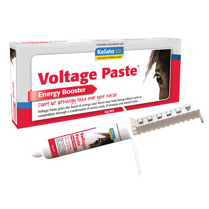 Voltage Paste gives the boost of energy your horse may need during intense work or competition. What is Voltage Paste? Voltage Paste gives the boost of energy your horse may need by delivering high quality amino acids, B vitamins and Gotu Kola (not to be confused with caffeine). In stressful situations, Voltage Paste will help to improve mental alertness, combat fatigue and aid concentration. It is a 100% natural, drug-free formula and does not contain caffeine. How does Voltage Paste work? Voltage Paste contains a combination of: Tyrosine An amino acid that improves mental alertness under stressful conditions. Aids concentration and focus. Helps minimise the impact of stressful situations. Histidine An essential amino acid that helps to maintain nerve function and blood vessel contraction and expansion. Strengthens the immune system by reducing the sensitivity to allergens. Supports tissue formation and repair. Arginine Improves circulation by dilating blood vessels. Aids in minimising insulin requirements, helping to maintain consistent blood glucose levels. Dimethylglycine (DMG) Increases oxygen uptake in the bloodstream. Increases stamina, conserves energy and delays the transition from aerobic to anaerobic exercise. Extending the aerobic portion of exercise delays the onset of fatigue (delays lactic acid accumulation). Gotu Kola Source of B vitamins. Aids concentration and focus. Supports energy conservation. Increases energy metabolism. Aids normal functioning of nervous system. Features and Benefits More responsive. More alert. More active. More energised. More focused. Energy without the fizz! Ingredients Tyrosine Histidine Arginine Dimethylglycine (DMG) Gotu Kola (source of B vitamins) Directions for Use Voltage Paste is designed to be mixed in the horse’s feed. Give a full tube of Voltage Paste 2 to 4 hours prior to the event. Feeding recommendations are for 500kg bo