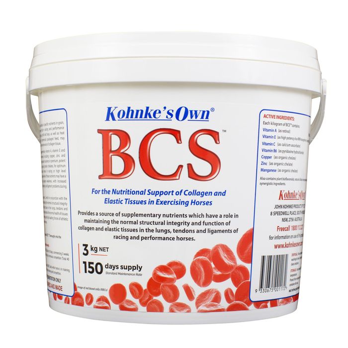 BCS Nutritional Support for Elastic Tissues in High Performance Horses Horses working intensely, whether in racing or equestrian sports, often struggle with the elasticity and integrity of collagen-rich tissues, including lung tissues, tendons and ligaments. For example, racehorses in training and racing can develop ‘bleeding in the lungs’ (EIPH), which greatly impacts performance and can end the career of promising gallopers or pacers. Kohnke’s Own BCS contains specific nutrients which have a role in maintaining the health and function of tissues subjected to the repetitive stretching and high loading forces of athletic activity in racing and performance horses. Horses in racing or high level equestrian training without adequate levels of the nutrients in BCS may have a higher risk of tendon and lung collagen weakness, with increased incidence of tendon injury, lung ‘bleeding’ and ligament problems during training.