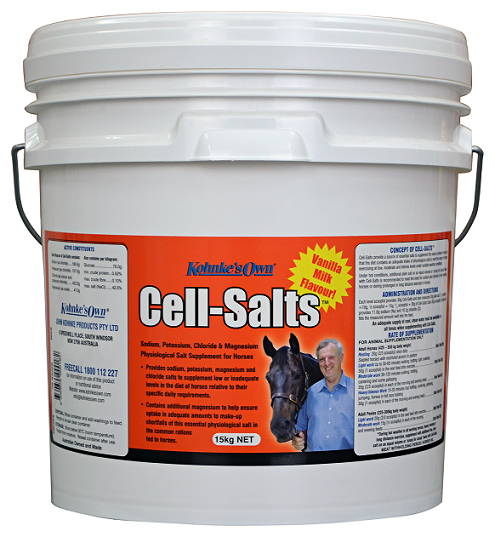 Cell-Salts Electrolyte Supplement of Concentrated Physiological Salts for Horses Many owners do not realise that horses require higher levels of salt, especially when moderately sweating during daily work. Adding an electrolyte mix to the ration will encourage your horse to drink as well as replace the important minerals lost through sweat. Kohnke’s Own Cell-Salts contains sodium, chloride, potassium and magnesium which are commonly lost in sweat from exercise and are crucial for body function and performance.