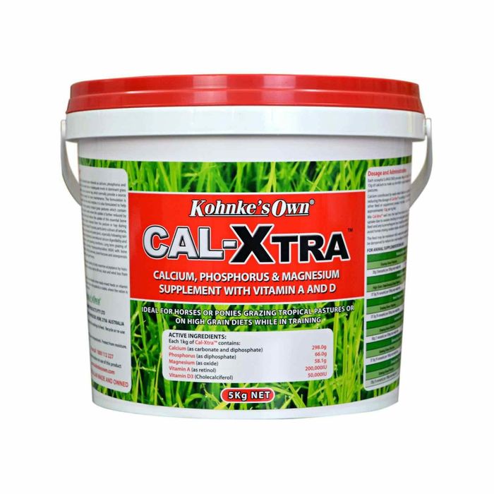 Cal-XTRA Calcium and Bone Mineral Supplement for Horses Grazing Oxalate-containing Pastures Cal-XTRA is formulated as a critical supplement for horses grazing in regions with oxalate-containing grasses, commonly in Queensland, The Northern Territory and parts of New South Wales and Victoria. Tropical and sub-tropical grass, particularly setaria, para, buffel, teff, pangola, kikuya, couch grass and green panic, contain oxalates which bind up and reduce the absorption of calcium, resulting in calcium deficiency which can lead to bone weakness. Cal-XTRA is a concentrated source of bone minerals, especially calcium, to ensure extra supply and help prevent bone demineralisation that would otherwise lead to lameness, osteoporosis and Big Head. Horses on high grain diets also benefit from the calcium and other nutrients supplied by Cal-XTRA to help bone strength and soundness during moderate to intense training.