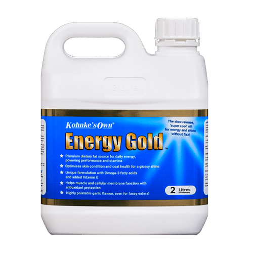 Energy Gold Highly Palatable, Premium Oil Supplement with added Vitamin E Energy Gold is a premium ‘super cool’ oil and fatty acid supplement, designed to deliver daily energy for performance, stamina and coat shine. Blended from cold-pressed, virgin Australian sourced oils, Energy Gold is a slow release, non-fizzy source of omega fatty acids, offering natural anti-inflammatory benefits and improved muscular function, as well as enhancing coat and skin health for a glossy shine. Energy Gold is garlic flavoured to please reluctant eaters and contains no preservatives or sugar, making it suitable for grain or sugar-sensitive horses and ponies as an energy source or coat conditioner.