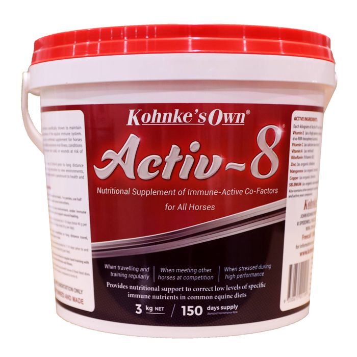Activ-8 Nutritional Supplement for Optimal Immune System Activity Activ-8 is formulated to support a strong immune system which is crucial for overall health and performance. Factors such as hard training, stress and illness can take their toll on your horse’s immune system with coughs and colds causing unnecessary down-time, health complications and potentially putting other horses at risk of infection. Kohnke’s Own Activ-8 features specific nutrients which work to improve the responsiveness of the equine immune system, ensuring optimum function to help with recovery. Horses can benefit from a course of Activ-8 following general sickness, intense competition, prior to long distance travel or when they’re at risk of exposure to respiratory viruses from other horses at events.