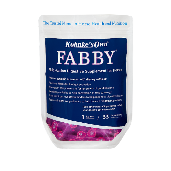 Multi-Action Digestive Supplement for Horses Kohnke’s Own FABBY is formulated using the latest scientific knowledge in probiotic and prebiotic research to help optimise the digestive efficiency of the hindgut (large intestine) in all horses. The highly concentrated probiotics, multiple premium prebiotics and other hindgut activating nutrients comprise a unique and powerful formulation that is suitable for horses of all ages and dietary intakes. The Premium Probiotic and Prebiotic Supplement with Hindgut Activators FABBY is an acronym for the many benefical active ingredients which naturally help your horse’s gut microbiota!