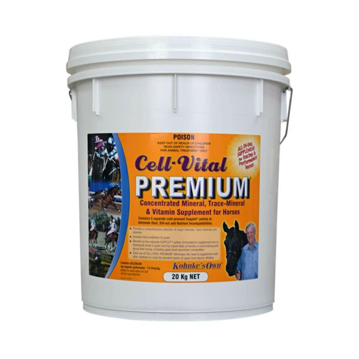 Cell-Vital Premium Premium Concentrated Bone Mineral, Trace-Mineral and Vitamin Supplement with Active Yeast Components Cell-Vital PREMIUM is a comprehensive formulation to meet the elevated needs of race horses in training, regular racing and performance horses in high intensity competition. Cell-Vital PREMIUM features premium forms of chelated trace-minerals and potency-protected vitamins, including higher levels of iron (3 forms for optimal absorption) and muscle antioxidants to power performance in hard working horses. Cell-Vital PREMIUM contains live active yeast with scientifically proven benefits in reducing hindgut acidity for horses fed high grain diets, plus nucleotides and other active yeast components, which have multiple roles in assisting conversion of feed to energy, as well as helping digestive efficiency & immune function.