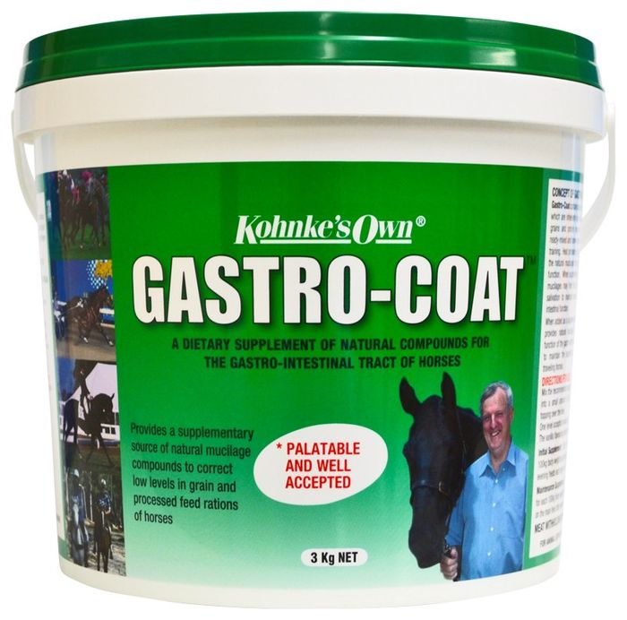 Gastro-Coat Natural Supplement for Stomach Irritation and Gastric Health Gastric ulcers (EGUS), or even mild gastric irritation can make horses sensitive in the stomach, girthy, reluctant to go forward or a picky eater. Gastric ulcers are a problem in 60-90% of horses in training and competition. Kohnke’s Own Gastro-Coat is a natural, helpful supplement for gastric issues, with multiple actions in the stomach and small intestine to help horses feel more comfortable, improving digestive health and maintaining appetite. Many vets prescribe omeprazole-based drugs when horses show symptoms of EGUS. Gastro-Coat is highly complementary to EGUS medications with different but synergistic actions. Gastro-Coat is also much more economical and can be used long-term without ill-effects.