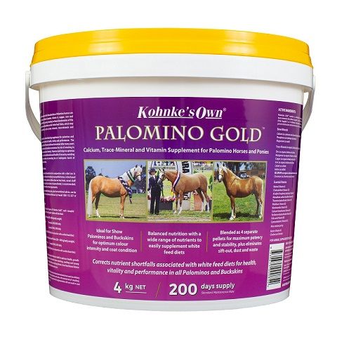 Palomino Gold Calcium, Trace-Mineral and Vitamin Supplement Specially Formulated for Palomino Horses and Ponies Palomino Gold is a premium supplement, exclusively formulated by Kohnke’s Own for optimum colour, health and vitality in Palomino horses and ponies. The innovative balance of nutrients works to enhance coat condition and depth of colour, while reducing the risk of black hairs and a patchy or uneven coat. Palomino Gold is particularly recommended for supplementation in horses on a ‘white diet’ to avoid ‘smutting’, to ensure they are not deficient in nutrients crucial for overall health and performance.