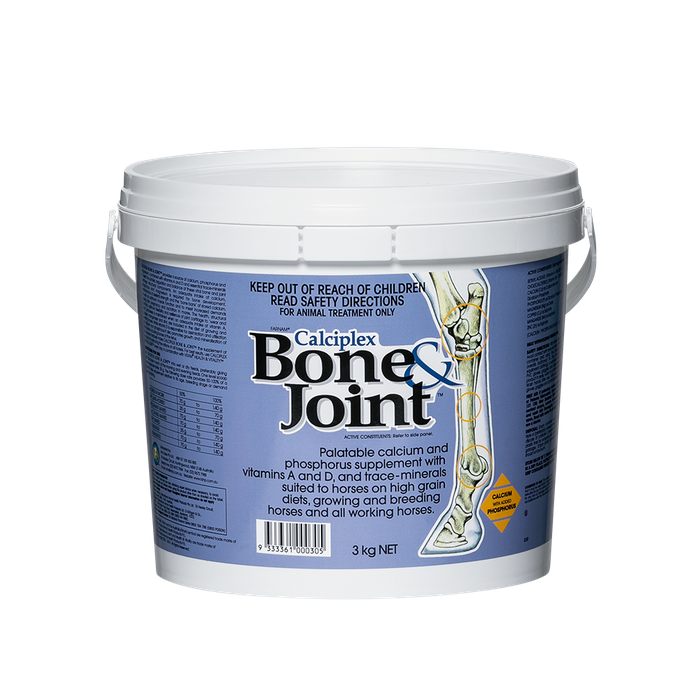 JOINT SUPPLEMENT FOR HORSES Calciplex Bone & Jointâ„¢ Calcium and phosphorus supplement with vitamins A and D A highly palatable calcium and phosphorus supplement with vitamins A and D, and trace-minerals suitable for horses on high grain diets, growing and breeding horses and all working horses. Formulated to provide a source of calcium, phosphorus and magnesium, combined with vitamins A and D and essential trace-minerals Calcium : Phosphorus Ratio 3.6 : 1 Highly palatable Pack sizes: 3 kg (contains 42 x 70 g doses), 15 kg (contains 214 x 70 g doses)