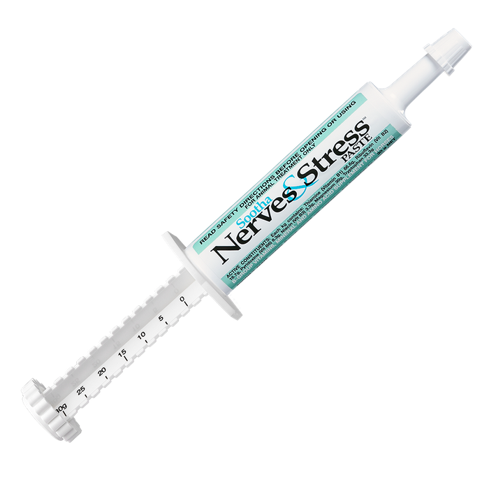 HORSES VITAMIN B SUPPLEMENT Sootha Nerves & Stress™ Paste B-group vitamins, minerals and amino acid supplement B-group vitamins, minerals and amino acid supplement for horses A high dose B-vitamin (B1, B2, B3, B6), magnesium and tryptophan supplement Some of the more obvious signs suggesting a need for SOOTHA NERVES & STRESS are: picky eating, pacing fences/stables, sweating, loose manure, running the ‘race’ before it starts, lack of concentration, irritable, unpredictable or ‘spooky’ behaviour and unwillingness to work For horses involved in racing or competition, SOOTHA NERVES & STRESS™ contains no prohibited substances Pack sizes: 30g syringe (20 per carton)