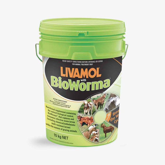 CONTROL NEMATODES IN MANURE SUPPLEMENT Livamol® with BioWorma® Biological control for worms with Livamol Nutritional supplement with the natural biological control, Bioworma®, to reduce infective nematode larvae within the manure of grazing animals Livamol® is the ideal delivery vehicle for BioWorma®, providing a nutritious base of proteins, energy plus added vitamins and minerals An in feed non-chemical biological control for the free-living stages of parasitic gastrointestinal nematodes of grazing animals Acts by substantially reducing the numbers of infective worm larvae emerging from manure onto pasture (including chemical/multi-resistant larvae) Biological control with Duddingtonia flagrans is applicable to the larvae of Horses, Cattle, Sheep, Goats and other grazing animals including Deer, Alpacas and Zoo animals A natural fungus that is safe, non-toxic and residue-free It has no negative effects on non-target soil nematodes, dung beetles, earthworms, microarthropods, soil bacteria and fungi. Pack sizes: 7.5 kg, 10 kg, 15 kg, 20 kg, 15lbs*, 30 lbs*