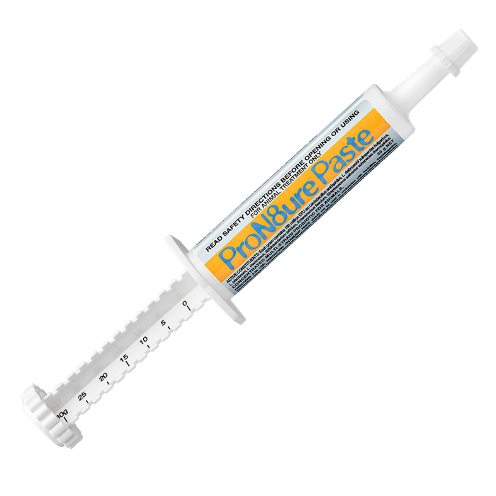 ANIMAL PROBIOTICS PASTE ProN8ure® Paste Concentrated multi-strain probiotic containing live beneficial bacteria ProN8ure® is a concentrated multi-strain probiotic containing live beneficial bacteria. A blend of live viable microbes which benefits the host animal by improving the intestinal microbial balance. ProN8ure® helps maintain a balanced digestive system, thus optimising digestion of feed and enhancing your animals' health, naturally. These microbes are safe non-toxic and residue free. ProN8ure® may be used during periods of stress Compatible with feed ingredients including anthelmintics, coccidiostats, minerals and vitamins, and some antibiotics. Pack sizes: 30 g syringe (20 per carton), 100 g syringe (15 per carton)