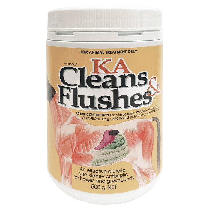 HORSE & GREYHOUND KIDNEY FLUSH KA Cleans & Flushes™ Effective diuretic and kidney antiseptic Effective diuretic and kidney antiseptic for horses and greyhounds A mild diuretic and antiseptic that helps clean and protect the kidneys and urinary tract from infection Simple indications of when KA CLEANS & FLUSHES may be used include smelly urine, thick urine or orange/darkish urine, or cloudy urine. Acts to “flush” the body of harmful compounds accumulated during exercise Acts by effectively cleansing the urinary tract to reduce the risk of low-grade bladder infection ‘cystitis’ Assists in promoting the action of the kidney, helping to increase urinary flow to eliminate problems such as ‘oedema’ of the lower limbs Pack sizes: 500 g , 3 kg, 10 kg