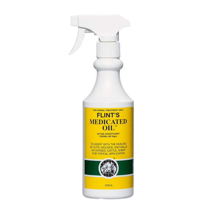 Flint's Medicated Oilâ„¢ Assist healing of cuts, wounds and galls on horses, cattle and sheep To assist with the healing of cuts, wounds and galls on horses, cattle and sheep for topical application Safe, gentle and soothing to use, has a long-lasting effect Prevents the formation of excess granulation tissue or 'proud flesh' The active ingredient Cresol kills disease causing gram-positive and gram-negative pathogens Provides a protective film to the healing wound and repels flies from the wound site Ideal for use on large cuts and lacerations, and to aid in the healing of all types of skin wounds Pack sizes: 200 mL spray pack, 500 mL spray pack, 1 L bottle