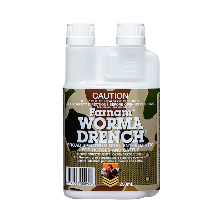 HORSE & CATTLE DRENCH, DEWORMER Worma Drench® Broad spectrum oral anthelmintic Broad spectrum oral anthelmintic for horses and cattle (dairy & beef) A broad spectrum single active ‘rotational’ oral anthelmintic for horses and cattle. Controls sensitive strains of adult and immature forms of large roundworms (Parascaris equorum), pinworm, large strongyles, adult stomach worm and small strongyles. Administer orally with accurate drenching equipment, disposable syringe, stomach tube, or by mixing thoroughly into the feed. Pack sizes: 250 mL, 1 L, 5 L, 25 L