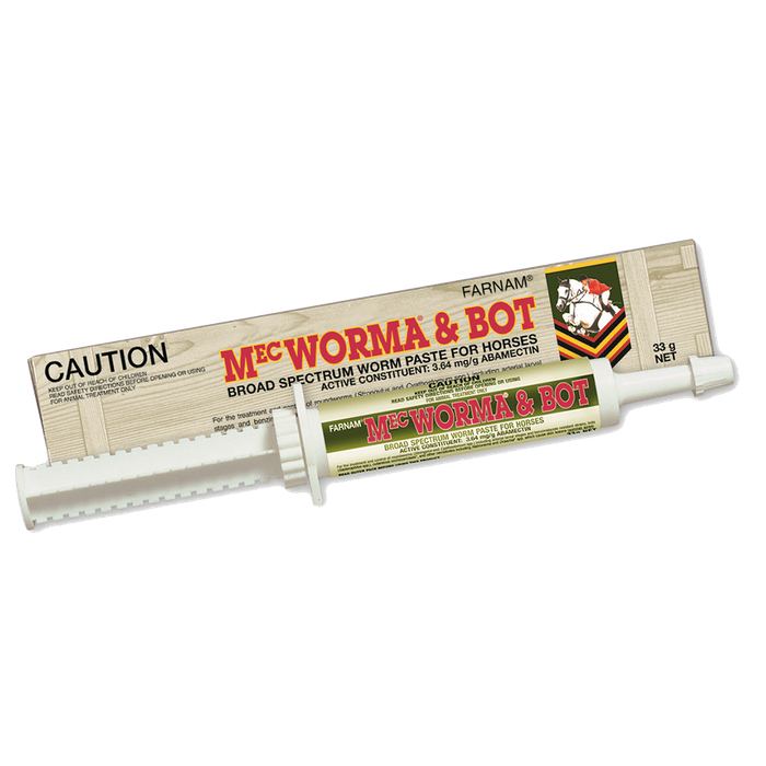 ONTROL STRONGYLES IN HORSES, HORSE DEWORMER MecWorma® & Bot Broad-spectrum worm paste Broad-spectrum worm paste for horses of all ages A broad spectrum single active ‘mectin’ oral anthelmintic Controls Large Strongyles, Small Strongyles, Ascarids (including adult and immature), Pinworms, Hairworms, Lungworms, Bots, Intestinal Threadworms, Neck Threadworms and Large Mouth Stomach Worms A complete syringe treats a 600 kg body weight horse Safe for use in horses of all ages Pack sizes: 33 g syringe (20 per carton), (50 per bucket)