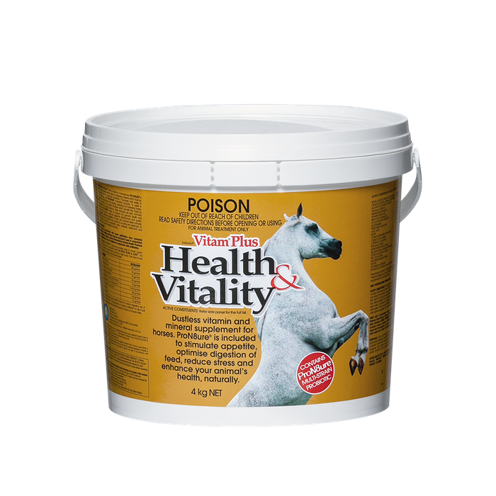 HORSE VITAMIN & PROBIOTIC SUPPLEMENT Vitam® Plus Health & Vitality™ Dustless vitamin and mineral supplement Dustless vitamin and mineral supplement for horses. ProN8ure® is included to stimulate appetite, optimise digestion of feed, reduce stress and enhance your animal’s health naturally Contains 12 vitamins, 9 minerals Contains ProN8ure® Multi-Strain Probiotic Dustless supplement Pack sizes: 4 kg (contains 133 x 30 g doses), 10 kg (contains 333 x 30 g doses)