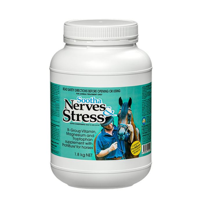 MAGNESIUM SUPPLEMENT HORSES NERVES Sootha Nerves & Stress™ B-group vitamin, magnesium and tryptophan with ProN8ure® B-group vitamin, magnesium and tryptophan supplement for horses with ProN8ure® (formerly Protexin) A high dose B-vitamin (B1, B2, B3, B6), magnesium and tryptophan supplement with ProN8ure® ProN8ure® (formerly Protexin) restores the gut microflora balance, helps to improve digestive efficiency and reduces the effects of stress Some of the more obvious signs suggesting a need for SOOTHA NERVES & STRESS are: picky eating, pacing fences/stables, sweating, loose manure, running the ‘race’ before it starts, lack of concentration, irritable, unpredictable or ‘spooky’ behaviour and unwillingness to work For horses involved in racing or competition, SOOTHA NERVES & STRESS contains no prohibited substances Pack sizes: 450 g (contains 15 x 30 g doses), 1.8 kg (contains 60 x 30 g doses), 4 kg (contains 133 x 30 g doses)