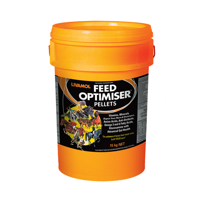 LIVAMOL HORSE FEED SUPPLEMENT Livamol® Feed Optimiser™ Pellets for Horses Scientific blend of vitamins, minerals, amino acids and anti-oxidants Scientific blend of vitamins, minerals, amino acids, anti-oxidants, fatty acids, glucosamine, plus proteins, fibre and energy, and PRO(N8)URE® Scientifically formulated supplement for addition to all types of horse feeds including growing, breeding, spelling and performance horses GRAIN FREE - 20% Protein, 8% Fat and 8 MJ/kg Digestive Energy 13 Vitamins, 15 Minerals and 4 Amino acids PRO(N8)URE® for gut health: dual strain probiotic, a prebiotic and multi-strain digestive enzymes Glucosamine, Electrolytes, Anti-oxidants and Mannan-oligosaccharides (MOS) Pack sizes: 15kg bucket, 25kg bag