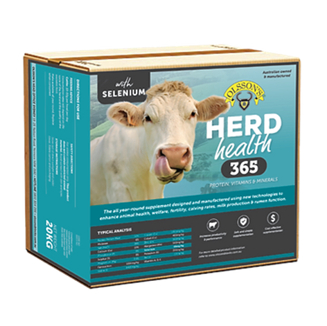 HERD HEALTH 365 An animal’s performance is limited by the quality of feed available. Even the best-looking pastures can lack the nutrients your herd need to thrive. Olsson’s Herd Health 365 is an advanced protein block containing a balanced array of trace elements, vitamins and minerals, providing targeted supplementation for cattle grazing all types of pastures in all seasons. It supports both bulls and cows for greater conception rates. Calf survival, lactation and optimal feed conversation can be expected with the daily use of this block. Herd Health 365 is designed to stand up to all weather conditions. Available in 20 & 40kg blocks.