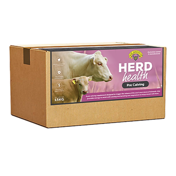 HERD HEALTH PRE CALVING A block designed for short term use just two weeks before calving. Olsson’s have designed this block to help trigger the release of the cow’s essential minerals stored over time by using the Herd Health 365. Herd Health pre calving provides energy and minerals such as magnesium to help with the physical calving also helping reduce the onset of milk fever. Energy for both cow and calf help with survival rates and lactation during this critical time. Available in 15kg blocks.