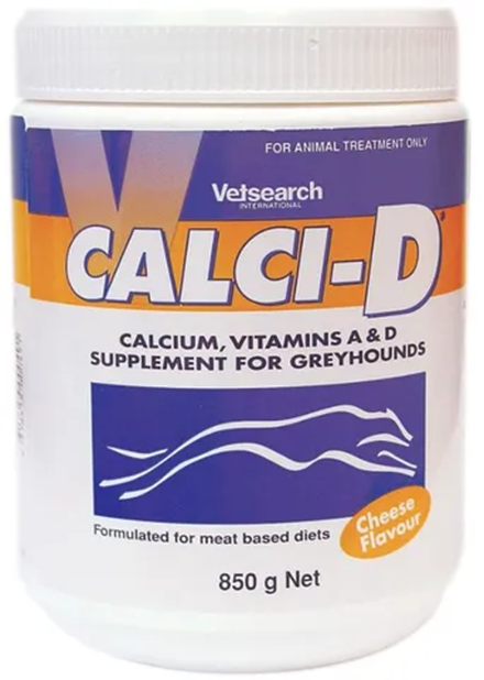 CALCI-D® calcium supplement for dogs Calcium, Vitamin A and D supplement to correct deficiencies and imbalances in the dietary calcium to phosphorus ratio in growing, racing, and breeding greyhounds on meat, and/or dry food diets. WHAT IS CALCI-D®? Corrects the imbalance of calcium and phosphorus in meat-based diets Helps to strengthen bones Palatable cheese flavour Ideal for pregnant bitches Liquid form ideal for puppies RECOMMENDED FOR Dogs in work Growing puppies & young dogs Pregnant & nursing bitches