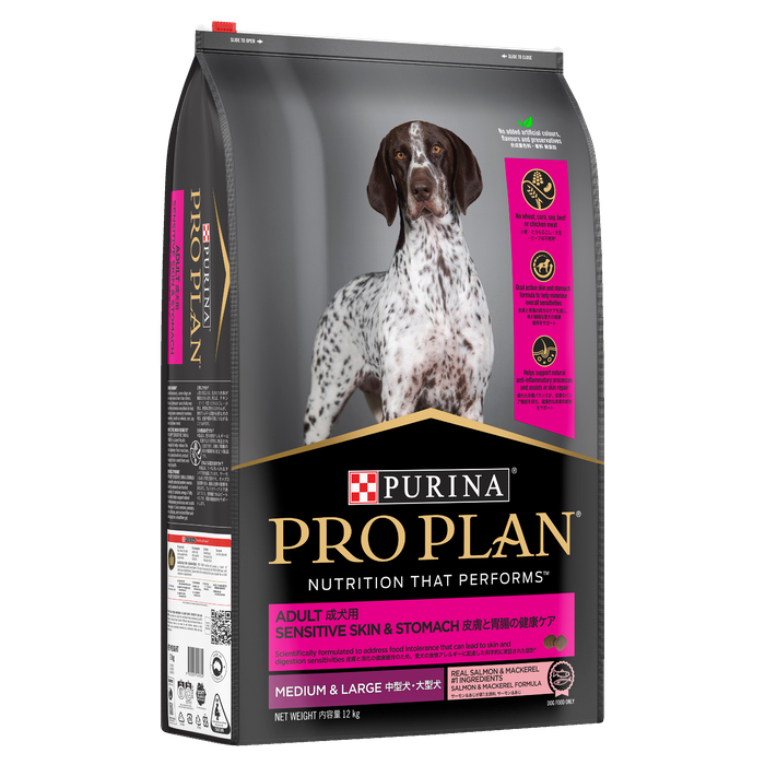 PRO PLAN Adult Sensitive Skin & Stomach Medium & Large Breed salmon & Mackerel Dry Dog Food is a scientifically developed, dual action formula to help minimise sensitivities. For dogs with wheat and meat intolerance, it is formulated without wheat, corn, soy, chicken and beef and helps reduce skin inflammation and assist in skin repair, while also maintaining skin moisture and firmness. It contains highly digestible and gentle ingredients for inflamed digestive tract. These recipes help provide targeted benefits, such as high digestibility and high nutrient absorption to support your dog’s long-term health. PRO PLAN Adult Sensitive Skin & Stomach Dry Dog Food is made with high quality salmon and mackerel, perfectly cooked for a delicious taste.