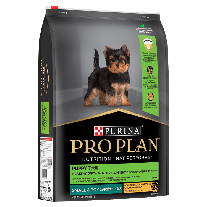 The first year of your dog's life is crucial to their long-term health, which is why they need nutrition specificially formulated to nourish their developing bodies and minds. PRO PLAN Puppy Small & Toy Chicken Dry Dog Food with Colostrum and Probiotics combines all the essential nutrients that puppies need, including colostrum - proven to boost the immune system and protect them from common intestinal upsets. These recipes help provide targeted benefits, such as high digestibility and high nutrient absorption to support your dog’s long-term health. The small, bite-sized kibble makes chewing easier for small or toy breed dogs. Now with PRO PLAN, you can nourish your pet’s microbiome with Probiotics to support their gut, immune and overall health.